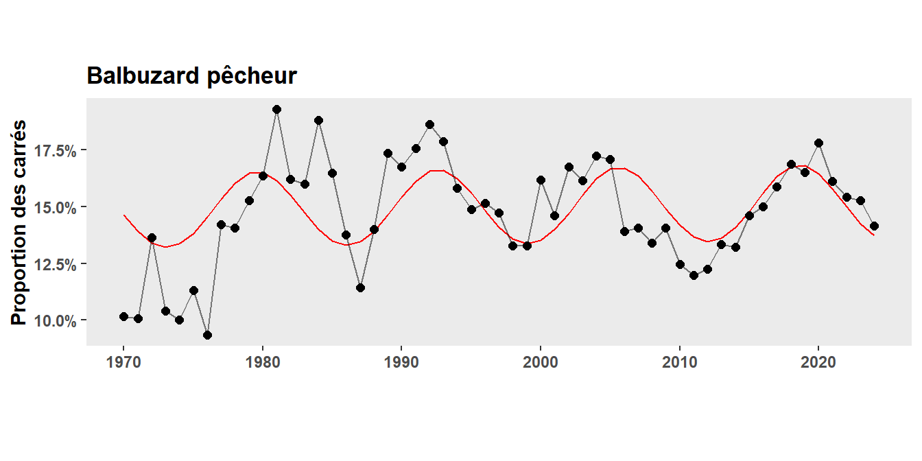 Plusieurs espèces révèlent de subtils patrons de périodicité, souvent noyés dans le “bruit” statistique. D’autres sont plus clairs. J’en retiens deux: le Balbuzard pêcheur et la Bernache cravant, tous les deux avec un cycle assez net de 13 ans. Des fluctuations dans l’abondance de nourriture? Lié aux mêmes causes que les cycles de cigales Magicicada (13 ou 17 ans), le soleil, les courants océaniques ?