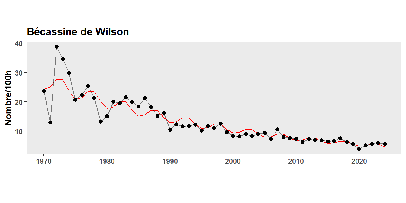 Il est bien connu que les limicoles (pluviers, bécasseaux, chevaliers, etc.) sont globalement en déclin. On attribue cela à diverses causes, notamment le dérangement et la prédation en migration. J’aurais pourtant pensé que ce n’était pas le cas de la Bécassine de Wilson. Je retiens ici le graphique d’abondance plutôt que la répartition, car c’est un oiseau peu grégaire, qu’on découvre surtout en se déplaçant. Pourquoi moins de bécassines? Je doute que ce soit un changement important dans nos latitudes; je serais donc tenté de blâmer nos voisins du sud (réflexe en vogue par les temps qui courent!). Mais votre hypothèse est sans doute aussi plausible que la mienne…