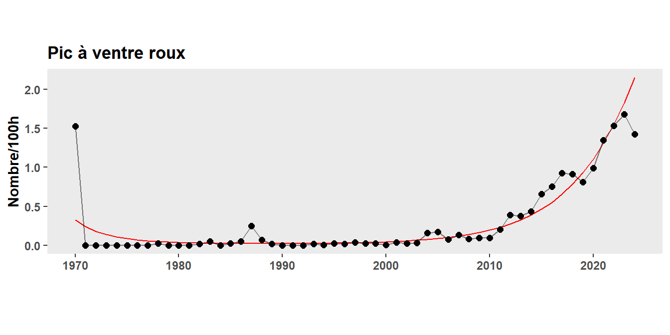 De son côté, le Pic à ventre roux étonne par son essor (j’ignore la donnée discutable de 1970). Parmi les pics, seul le Pic à tête rouge semble avoir des difficultés au Québec, les autres étant stables ou en forte hausse.